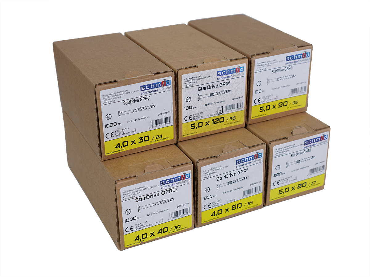 sowie je einer Schachtel Schrauben STARDRIVE GPR Schrauben der Type 4,0x30/24, 4,0x40/30, 4,0x60/35, 4,5x80/39, 5,0x100/55 und 5,0x120/55