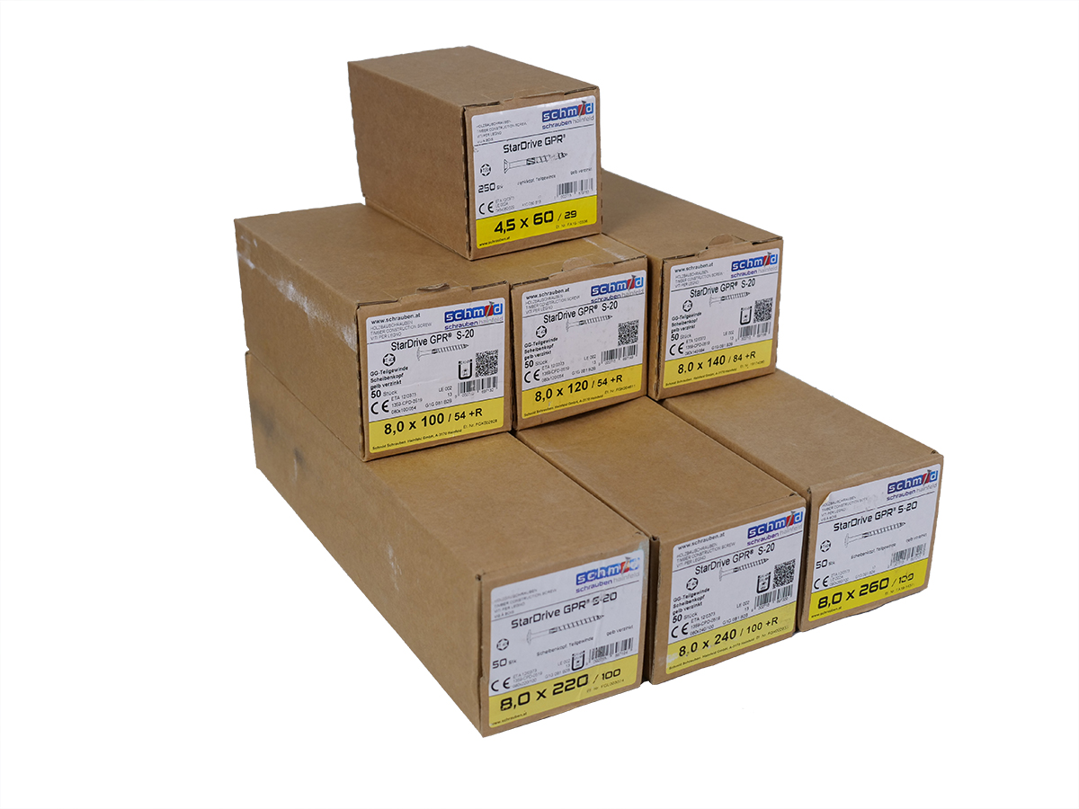 - je 1 Schachtel Schrauben mit 50 Stück STARDRIVE GPR-S20 der folgenden Typen 8,0x100/54R, 8,0x120/54R, 8,0x140/84R, 8,0x220/100R, 8,0x240/100R, 8,0x260/100R